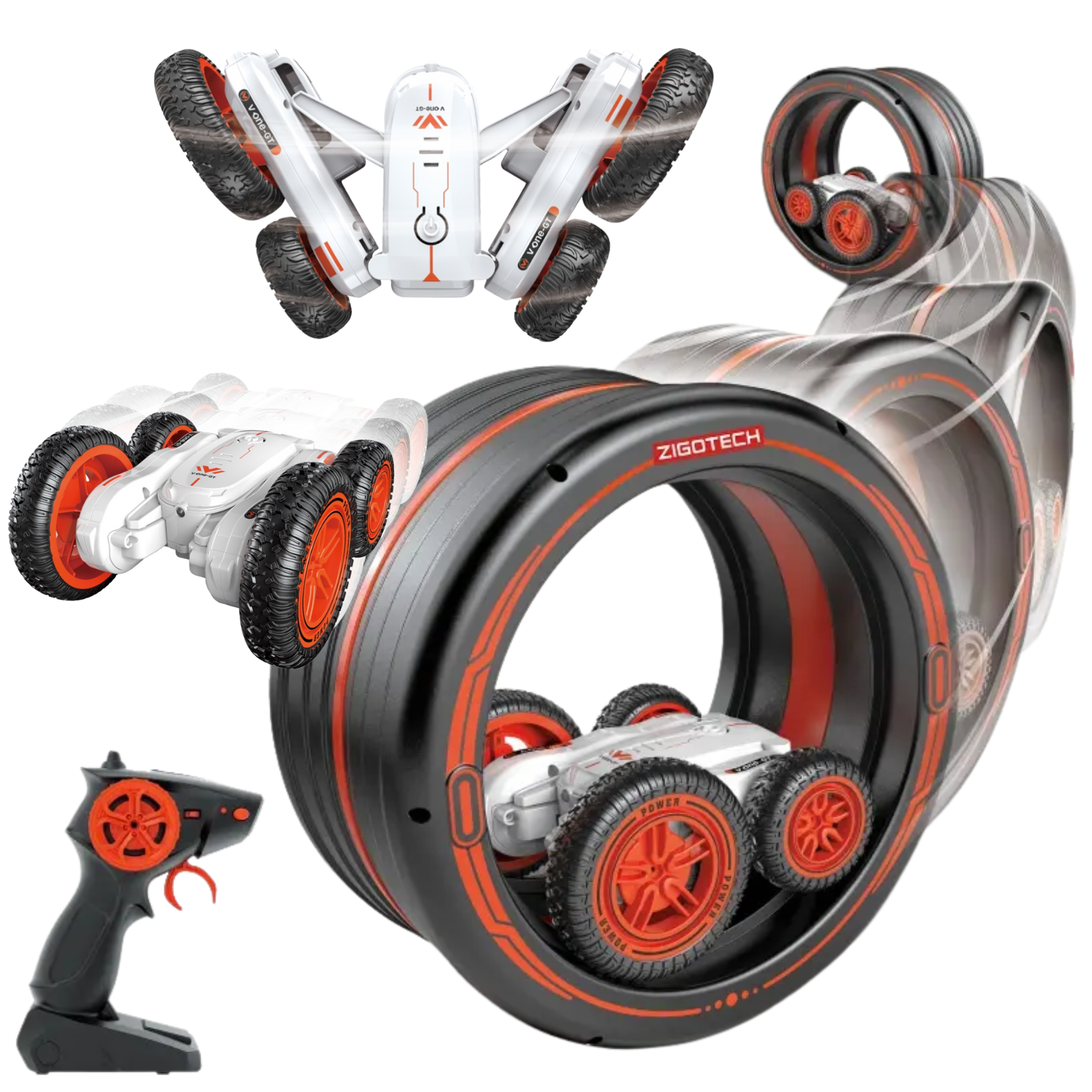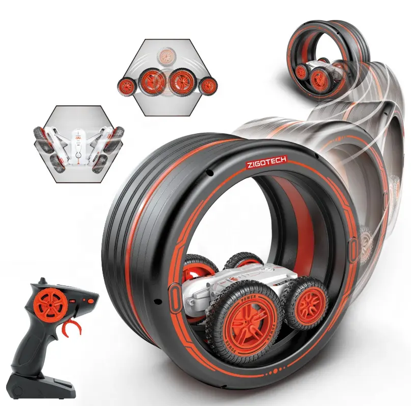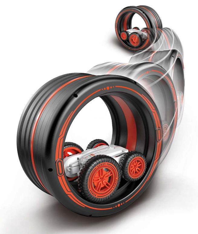 Zdalnie sterowany, szybki się samochód z kołem kaskaderskim. Całość ma unikalną konstrukcję, która pozwala mu wykonywać akrobacje na dwóch kołach, obracać się z dużą prędkością i pokonywać przeszkody. Zestaw zawiera koło kaskaderskie, którym można jeździć, kręcić razem z samochodem lub wykorzystać jako kaskader do przeskoczenia.