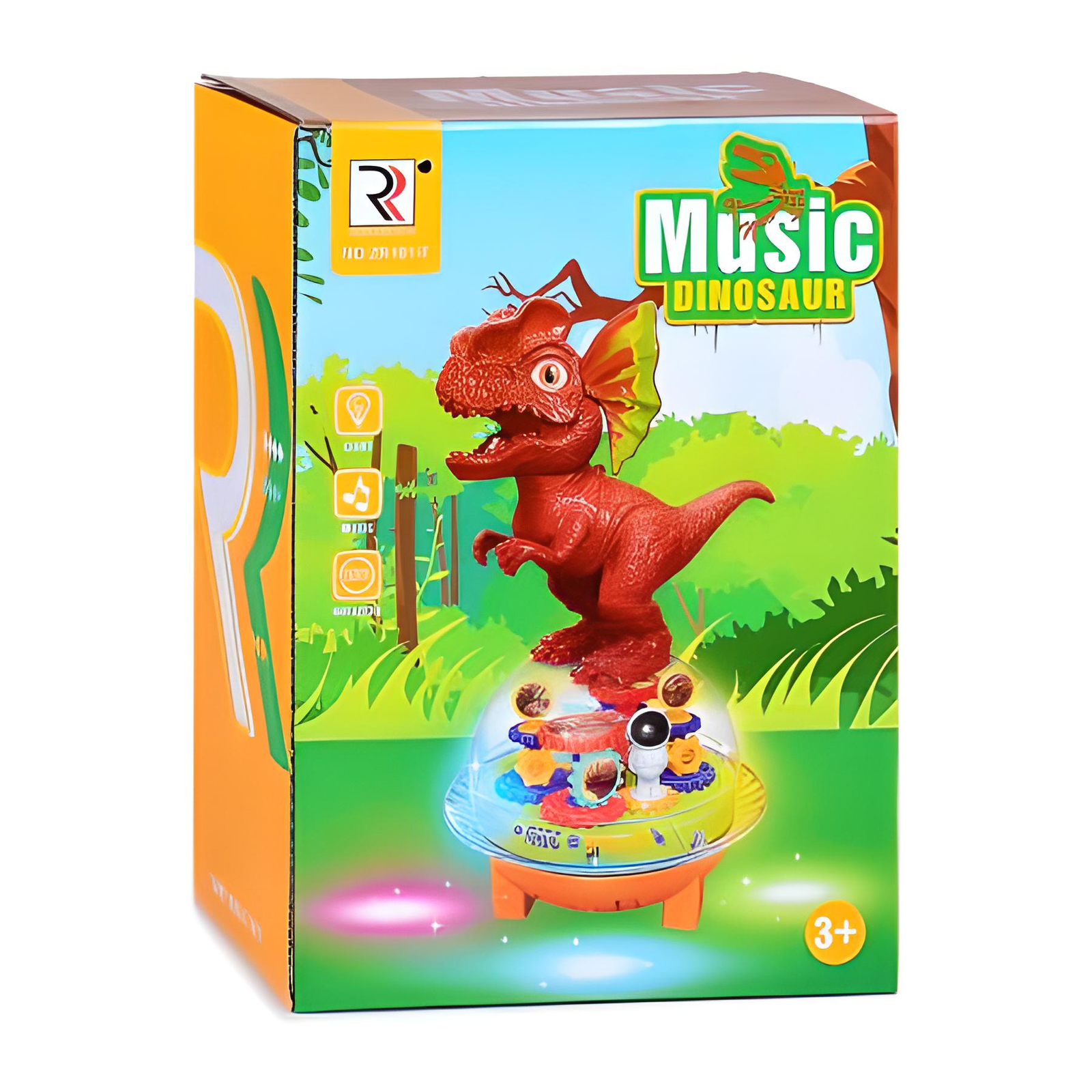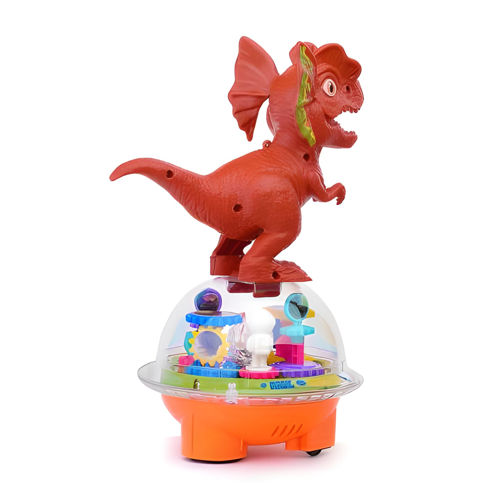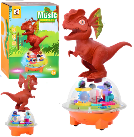 Dinozaur porusza się w rytm wydających przez siebie dźwięków. Ponad to dziecko może obserwować ruch zębatek, które wprawiają go w ruch! Postać obraca się w dowolnym kierunku, w akompaniamencie wyjątkowej muzyki!