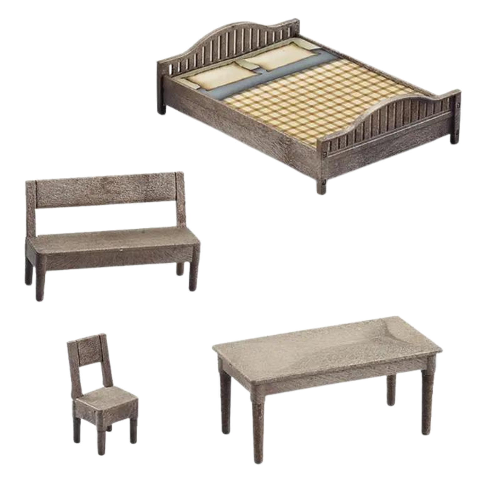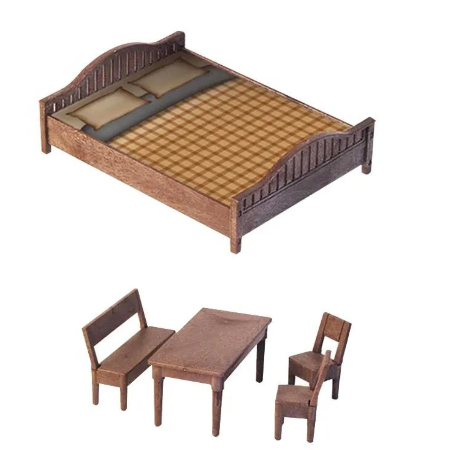 • meble (łóżko, 2 krzesła, stół, ławka)