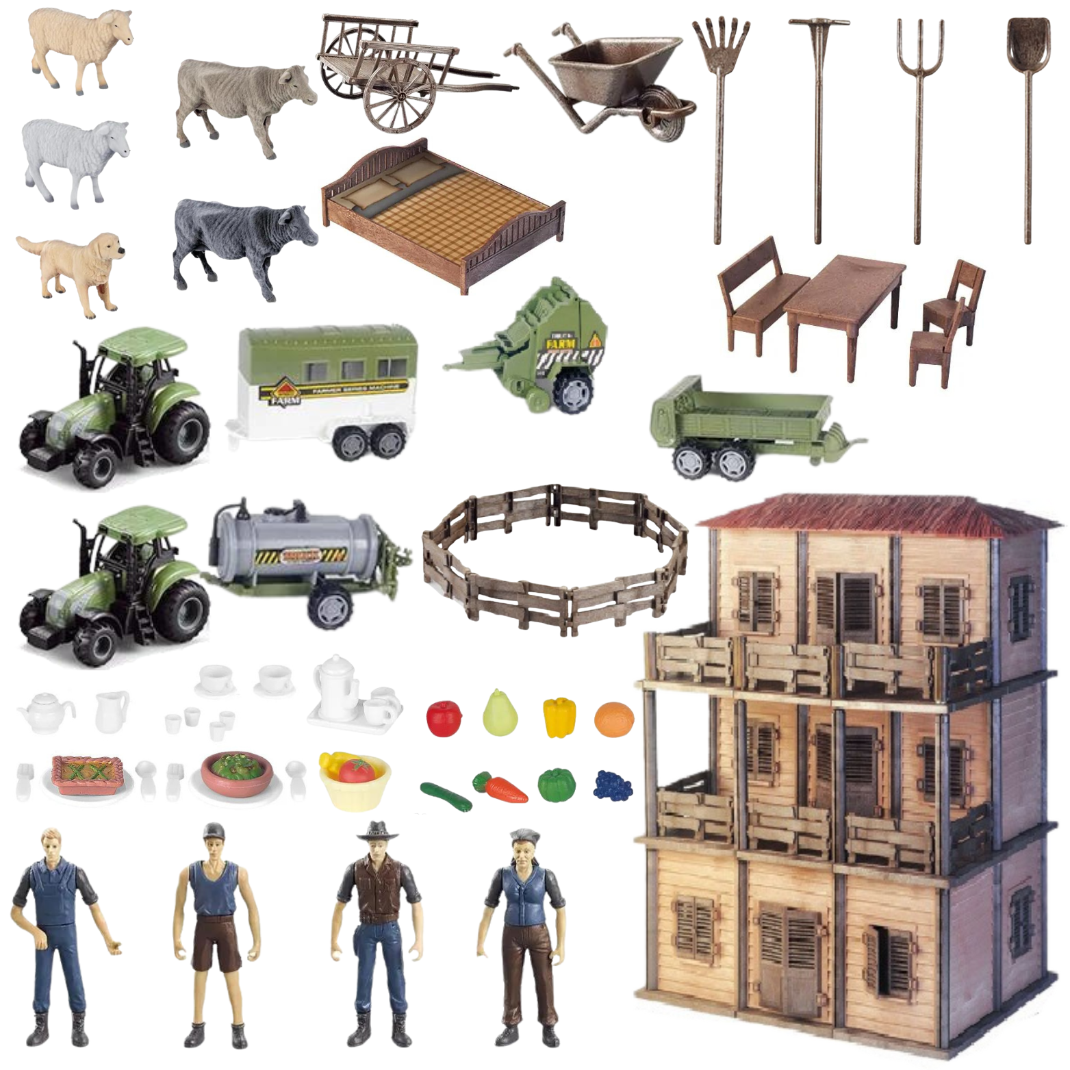 Zestaw ten składa się z wielu elementów, które pozwalają dziecku stworzyć swoją wymarzoną farmę. Domek, narzędzia rolnicze, stół, krzesła, ławka, łóżko, zwierzątka, owoce, naczynia i wiele innych detali tworzy realistyczne środowisko wiejskie. Dzieci uwielbiają interakcję, a w tym zestawie znajdują się zarówno sympatyczni rolnicy, jak i urocze zwierzątka wiejskie, takie jak krówki, owieczki i piesek. To doskonała okazja do rozwijania empatii i opiekuńczych umiejętności. Nie może zabraknąć tradycyjnego rolniczego traktora, a w tym zestawie znajdują się aż dwa! Dziecko może jeździć nimi po farmie, przewozić owoce czy inne przedmioty i bawić się jak prawdziwy rolnik.