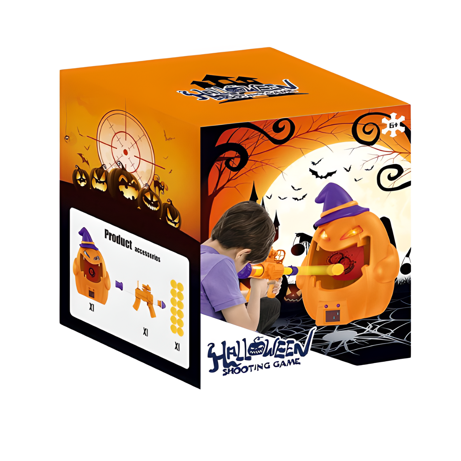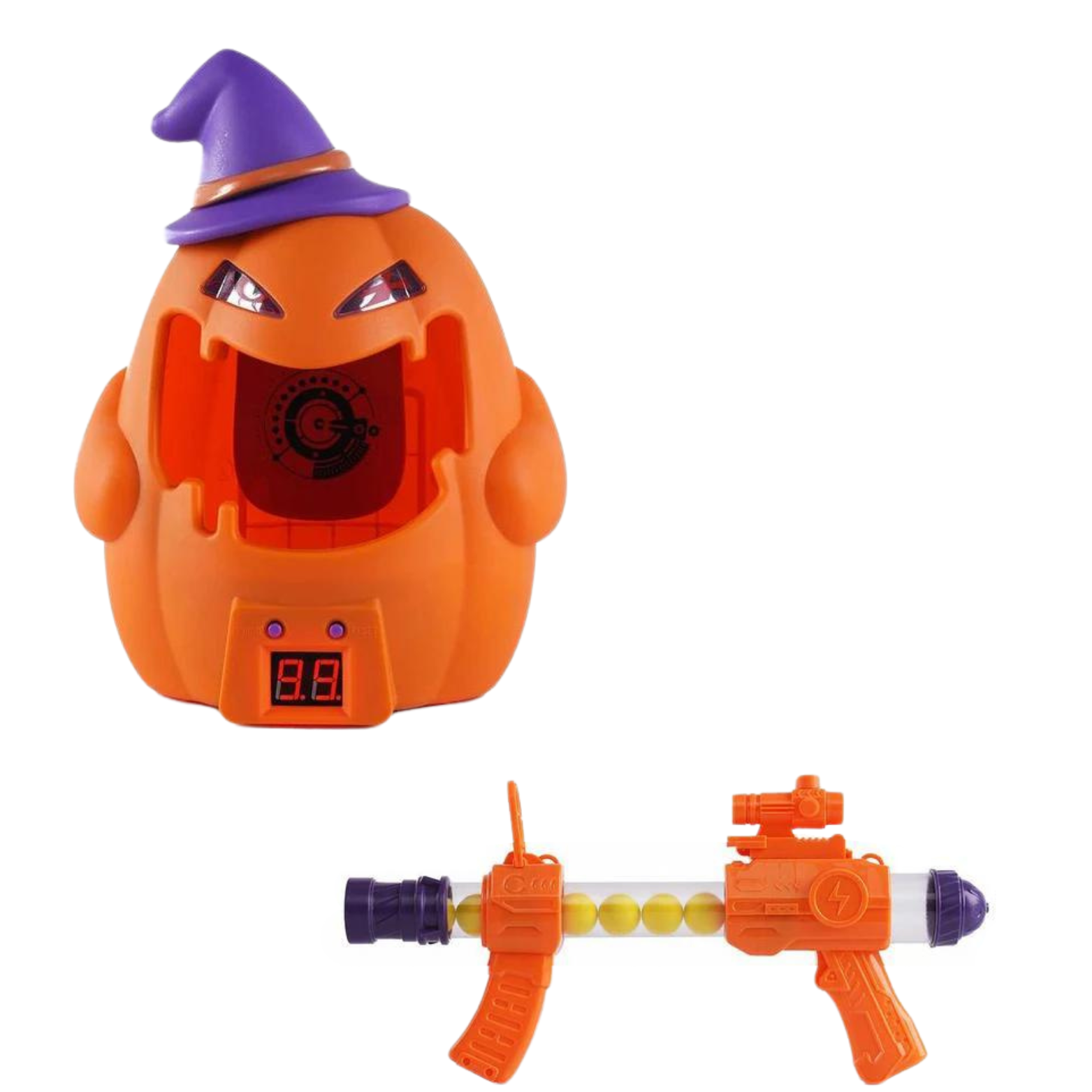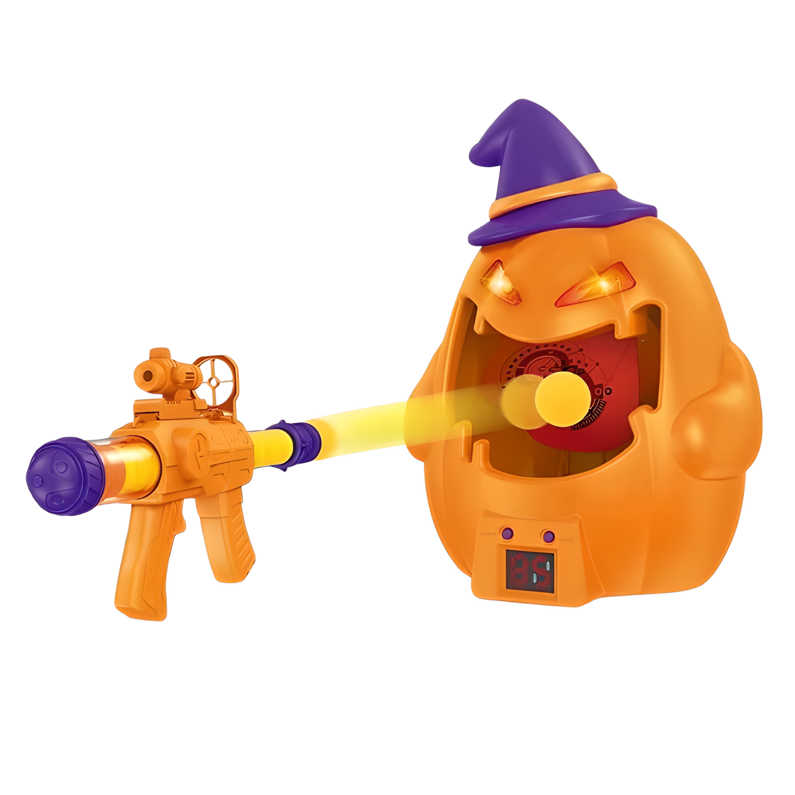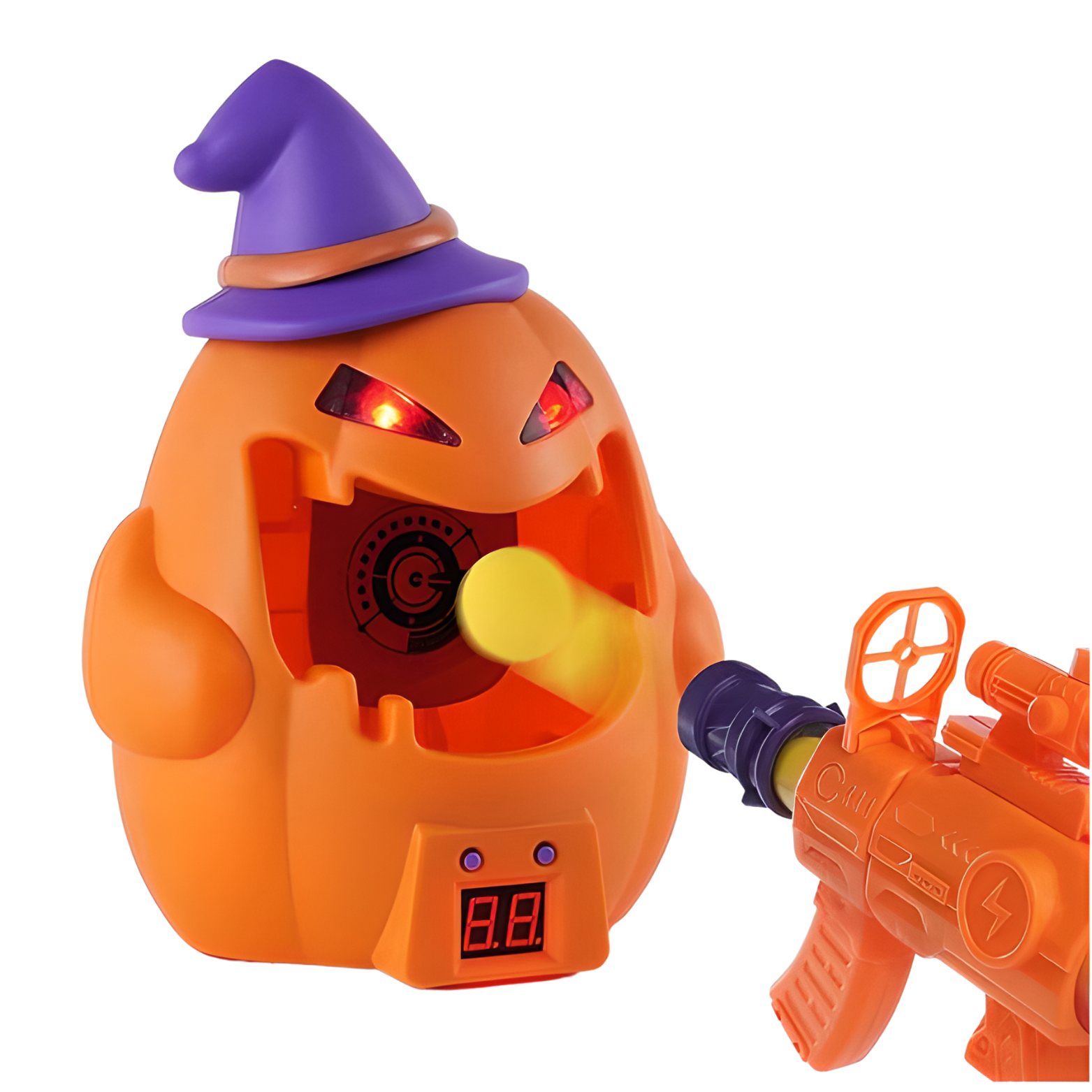 W skład zestawu wchodzi dynia z licznikiem celnych strzałów, specjalny pistolet na piłeczki oraz 12 piłeczek z pianki. Celem zabawy jest trafienie jak najwięcej razy w cel, a każdy celny strzał wyświetli się na wyświetlaczu i spowoduje wydanie dźwięku. Efekty świetlne i dźwiękowe dodają emocji do rozgrywki i sprawiają, że gra staje się jeszcze atrakcyjniejsza.