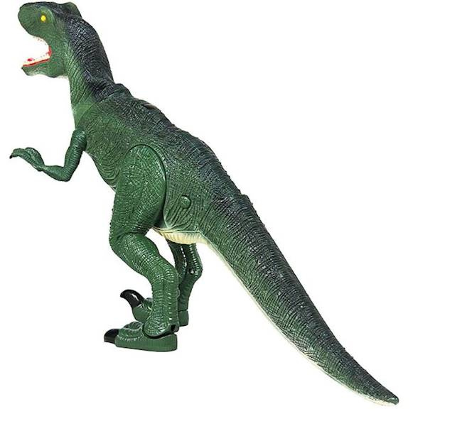Wysokiej jakości dinozaur sterowany radiowo Velociraptor w kolorze zielonym firmy Dinosaur Planet. Zabawka może chodzić tam i z powrotem, warczeć jak prawdziwe zwierzę i otwierać pysk. Wyposażony w podświetlane oczy. Będzie dobrym prezentem dla małego fana antycznych gadów.