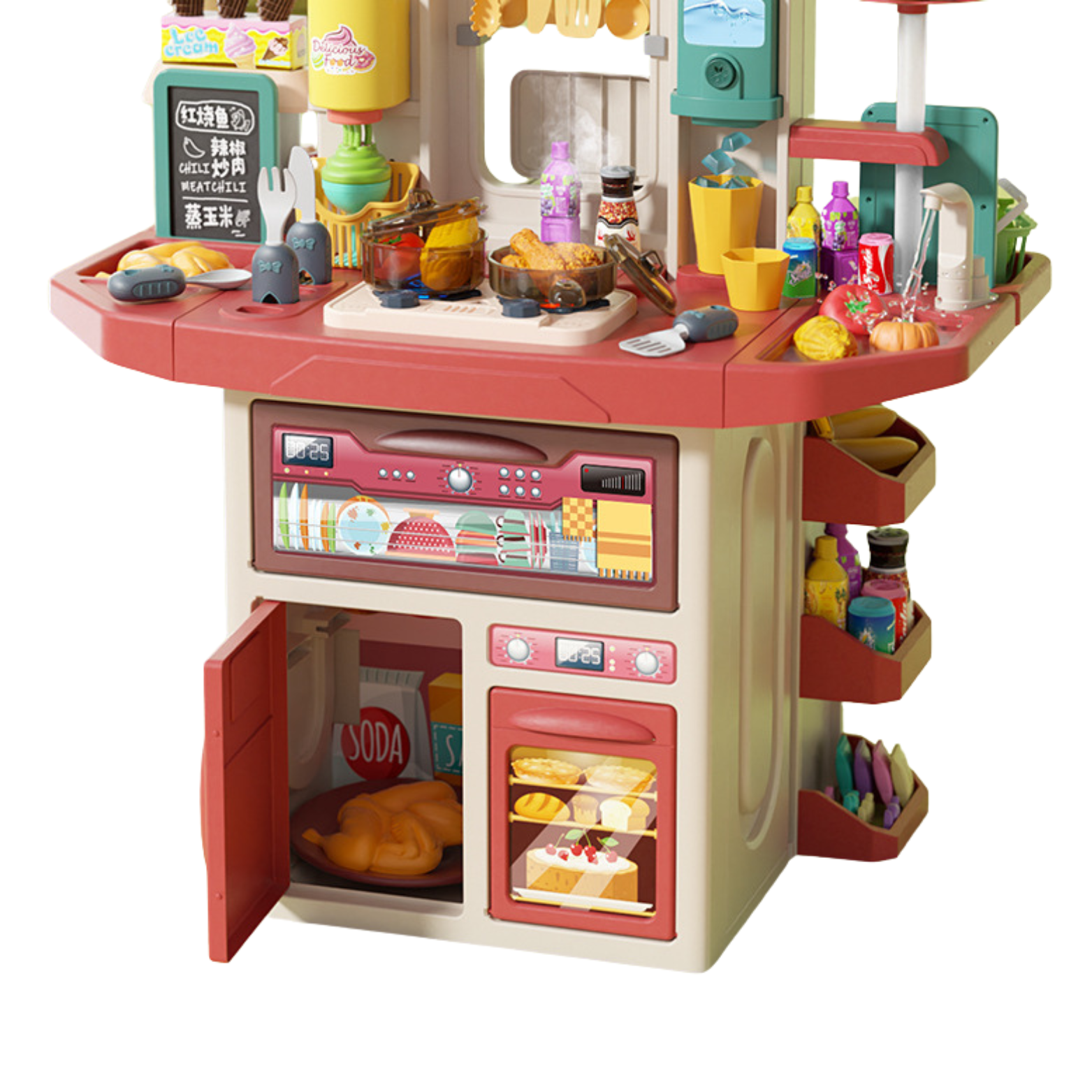 W zestawie znajduje się maszynka do lodów i ozdabiania ciastek, co pozwala na kreatywne eksperymentowanie i przygotowywanie niezwykłych deserów. Kuchnia posiada również kostkarkę do lodu, dodając element autentyczności do zabawy. Interaktywny okap posiada lampkę LED, działający wiatrak oraz melodię. Tablica kredowa umożliwia dziecku kreowanie własnych przepisów i zaplanowanie kulinarnych działań. W zestawie z tablicą znajdują się kredy i gąbka do ścierania.