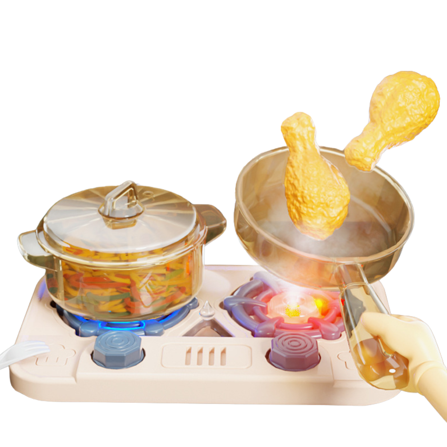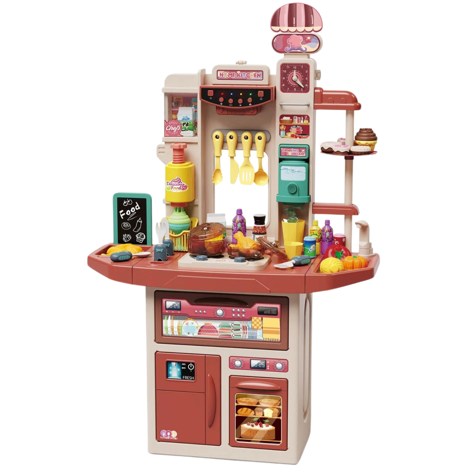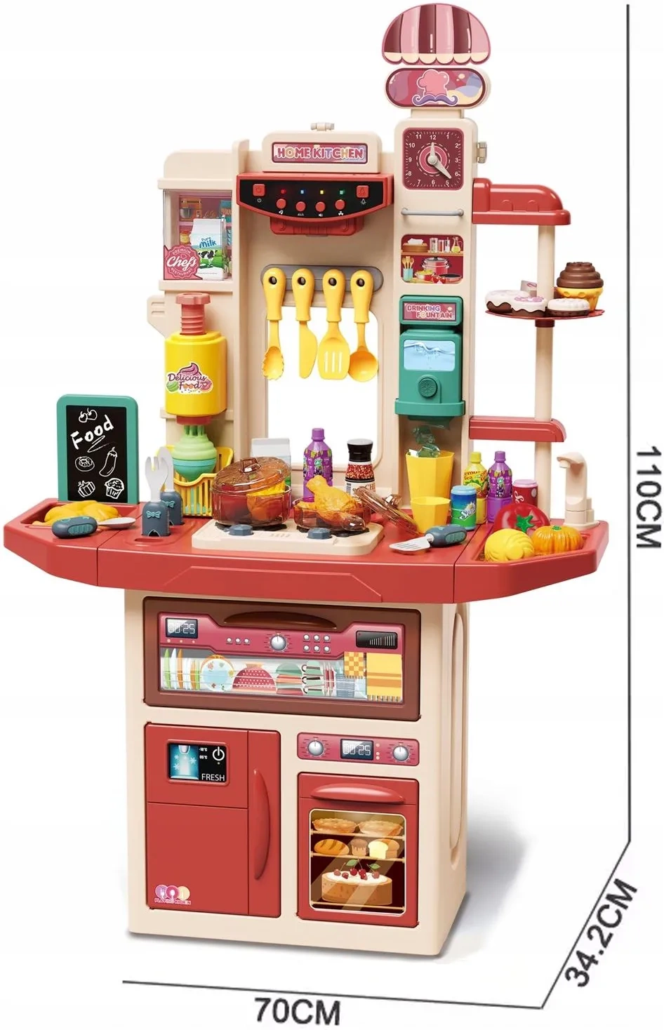 Kuchnia posiada prawdziwy kran z funkcją wody, co pozwala maluchowi na mycie warzyw, owoców i naczyń. Podczas gotowania na kuchence słychać autentyczne odgłosy gotowania i smażenia, a wydobywająca się para sprawia, że zabawa nabiera realizmu. Dodatkowo, palniki kuchenki są podświetlane.