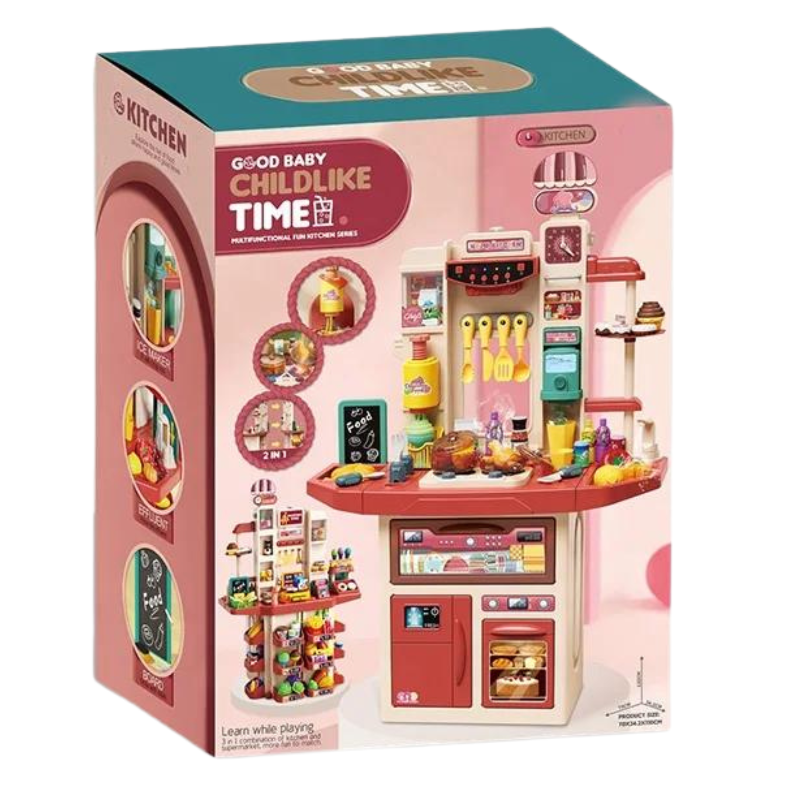 Wszystkie drzwi w kuchni, takie jak drzwi szafki, lodówki, piekarnika czy mikrofalówki są otwierane, dzięki czemu maluch ma miejsce na przechowywanie wszystkich elementów oraz pozwala to na interaktywną zabawę. Zegar z ruchomymi wskazówkami pozwala na naukę odczytywania czasu i organizacji działań w kuchni.