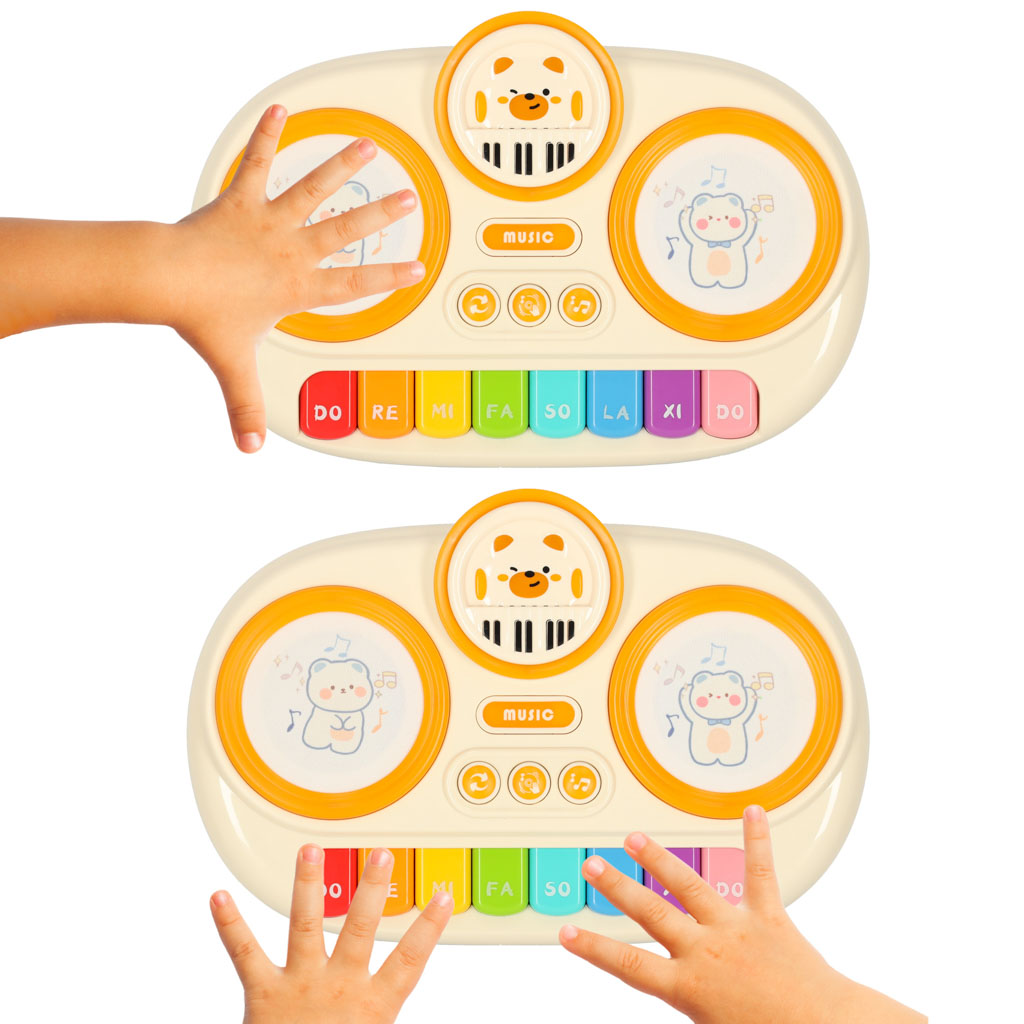 dłonią, a zabawka odtwarza rytmiczne dźwięki bębnów z melodyjką, dając dziecku