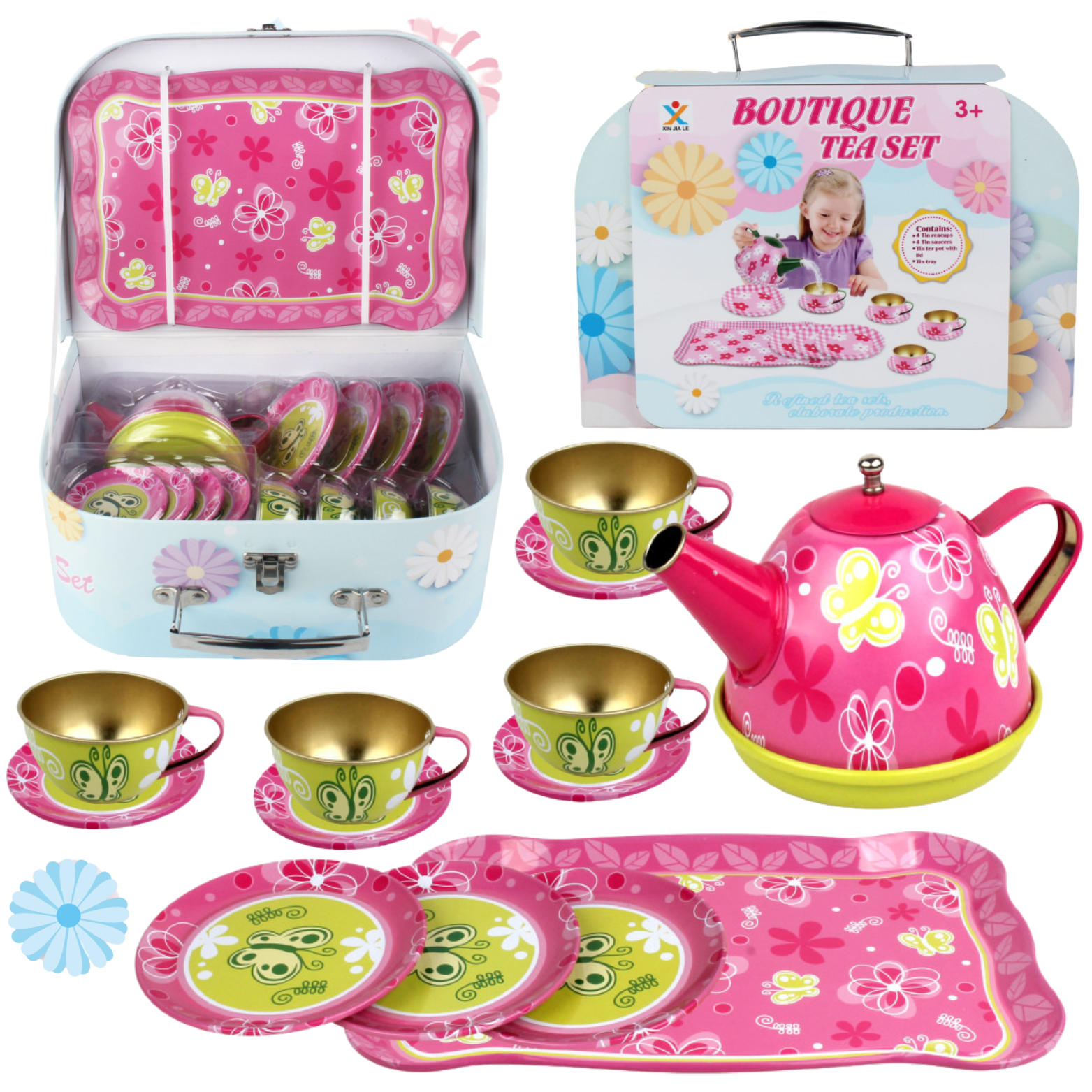 Uroczy zestaw do herbaty dla dzieci z pięknym motywem motyli i kwiatów to wyjątkowa zabawka, która przenosi dzieci w magię herbatkowych spotkań i przyjęć.