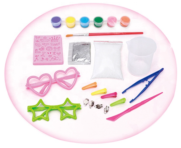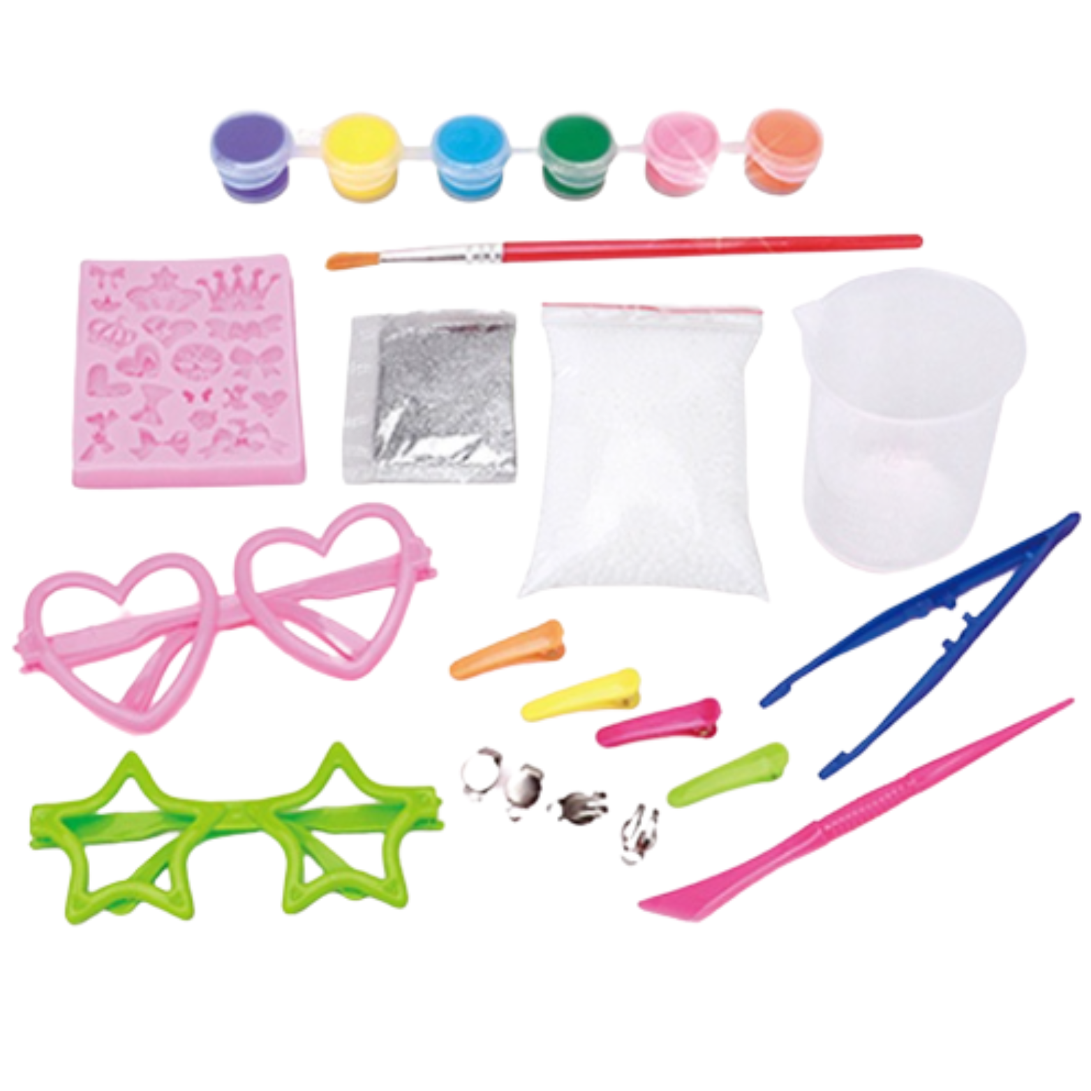 Zestaw zawiera okulary, koraliki, farbki, pędzel pęsetę, wzornik z różnymi formami, suchy klej i wiele innych. Zestaw różni się od innych tym, że mała artystka będzie musiała od podstaw, stworzyć własnoręcznie ozdoby do bransoletek, spinek itp. Wzornik posiada szeroki wybór form, spośród których, dziecko jest w stanie wybrać coś dla siebie!