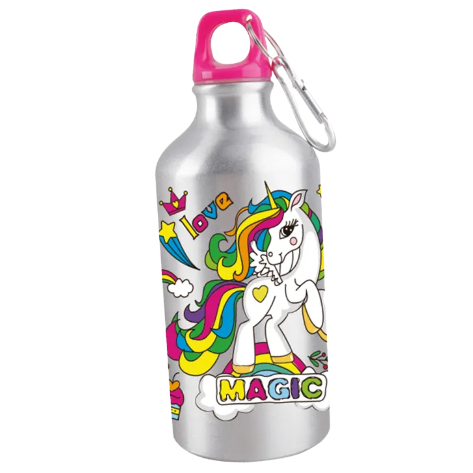 Metalowy bidon z akcesoriami do samodzielnego ozdobienia butelki to doskonały sposób, by rozbudzić kreatywność maluchów i jednocześnie zapewnić im funkcjonalny, praktyczny gadżet.