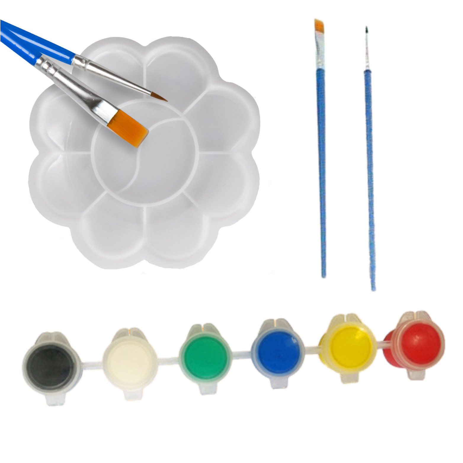 W zestawie znajduje się 6 farb, co pozwoli na tworzenie bogatych i zróżnicowanych projektów. Dodatkowo, 2 pędzle o różnych rozmiarach.