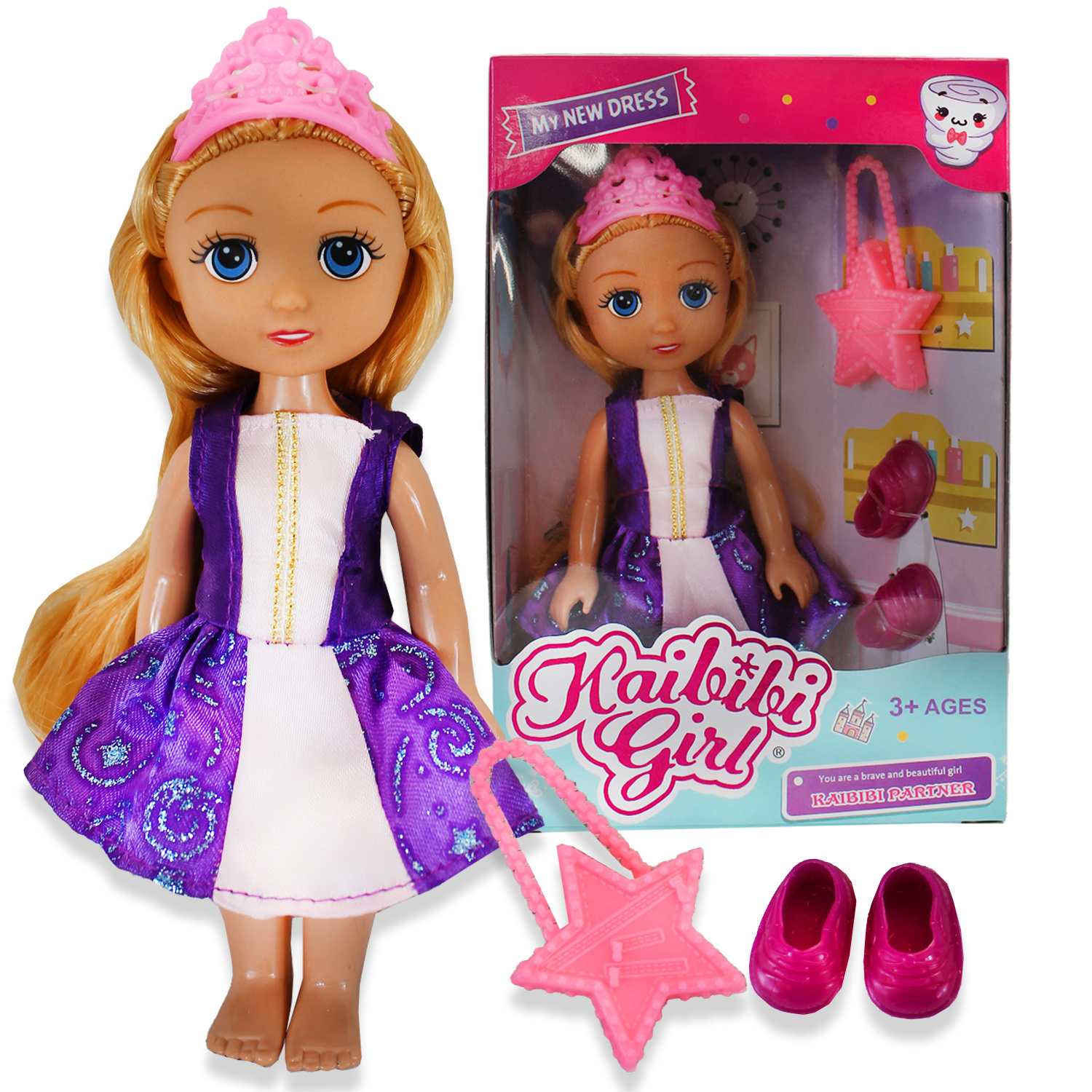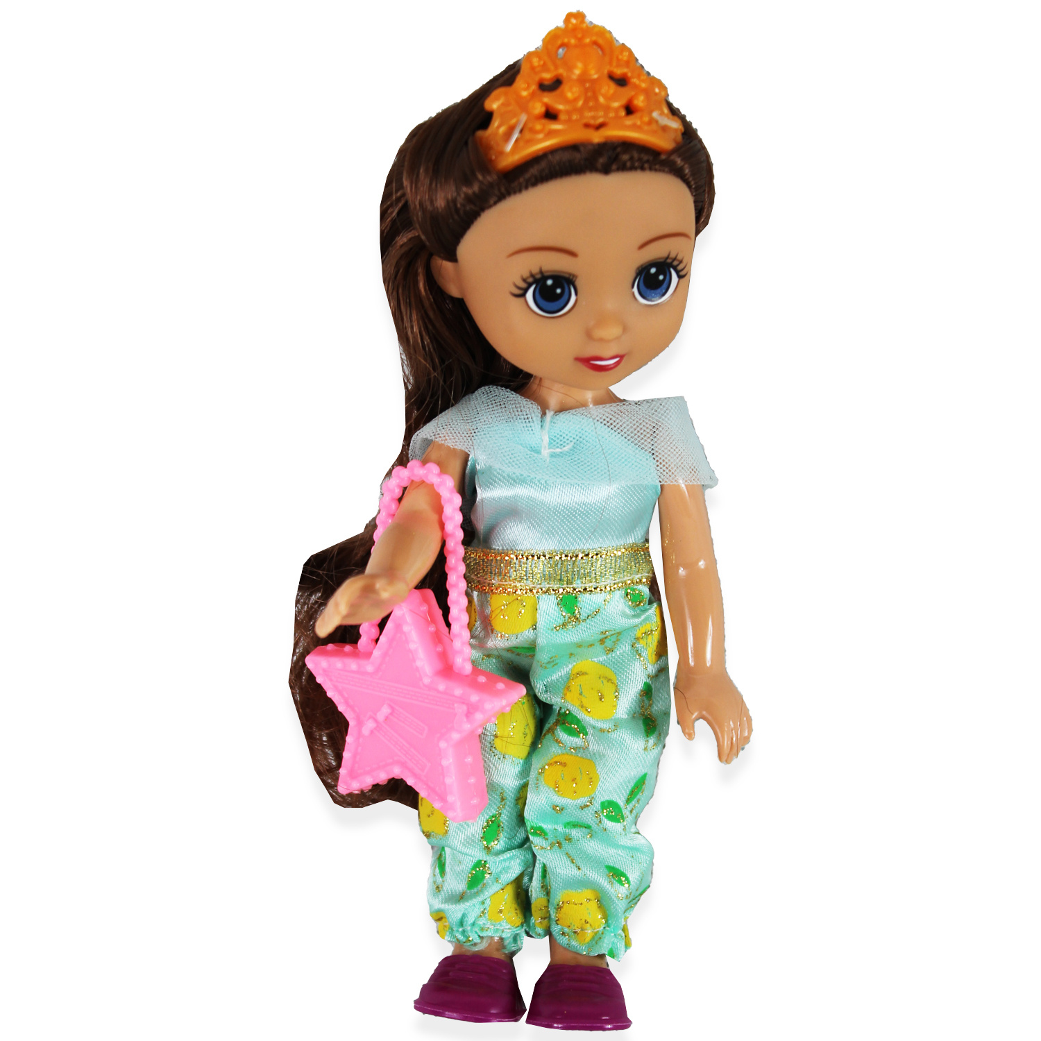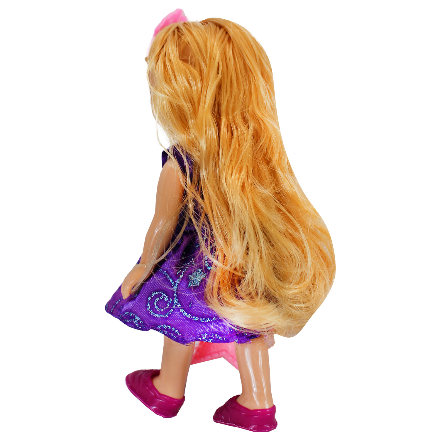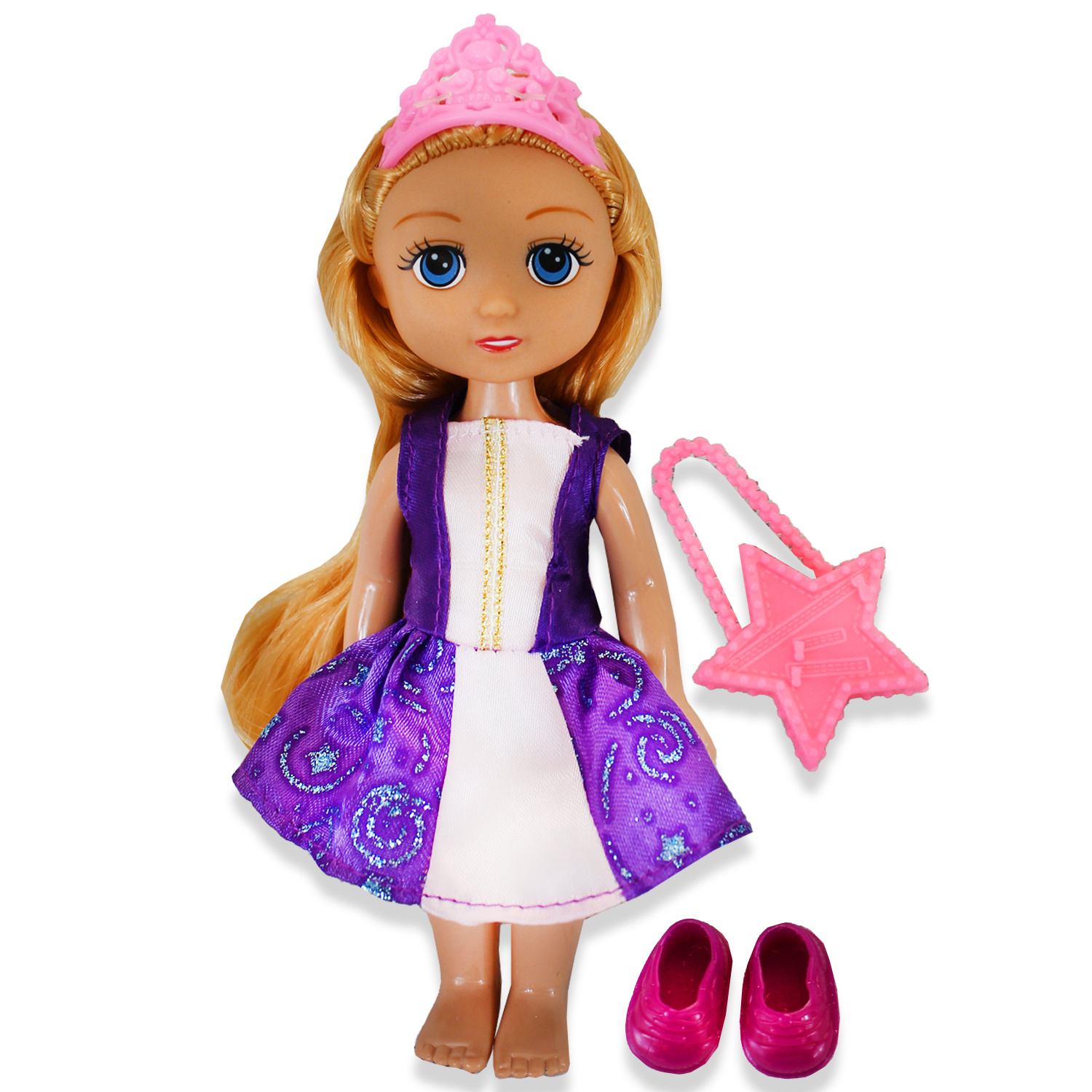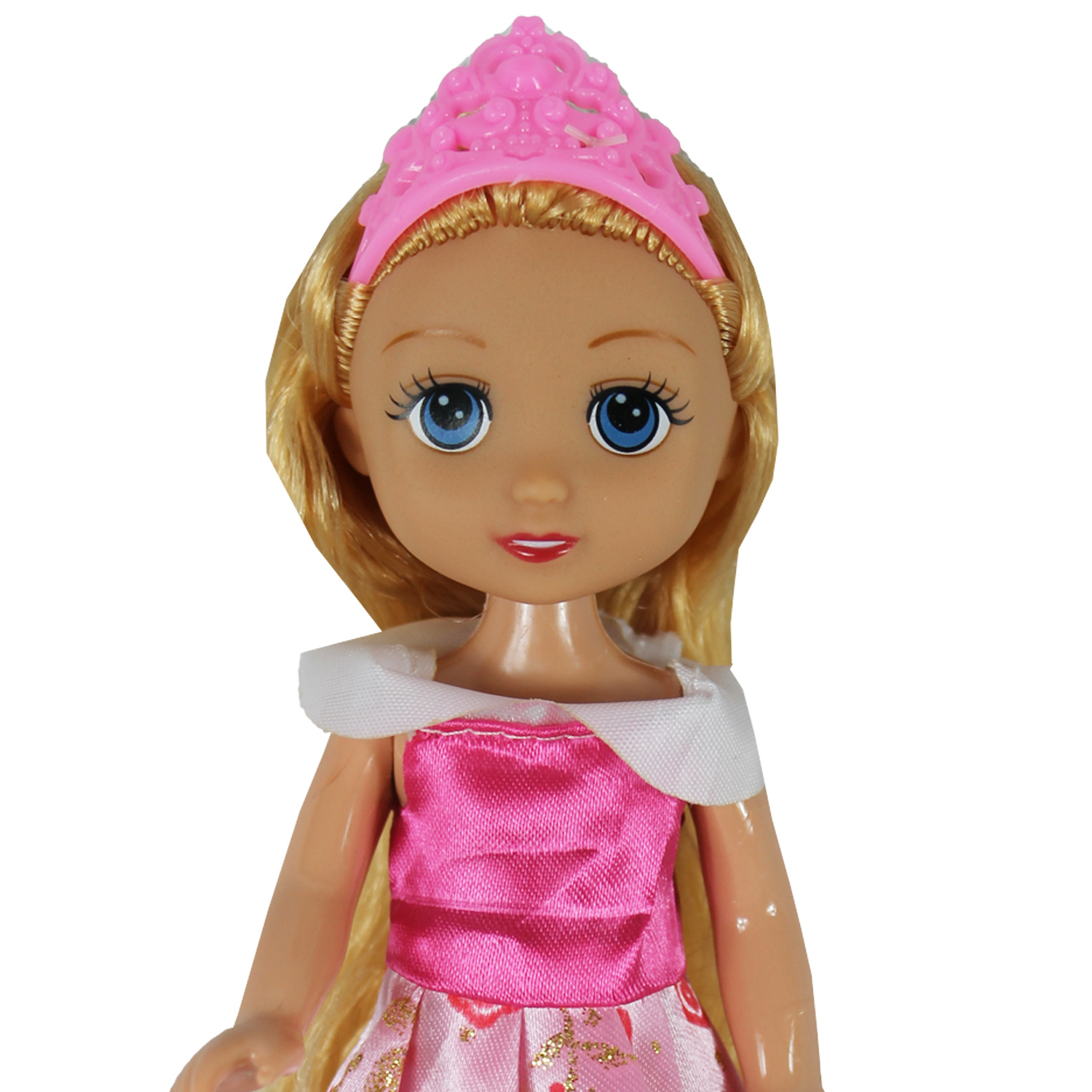 Księżniczka w czterech wersjach do wyboru jest piękną lalką z długimi włosami. Nosi cudowne ubranie, a na głowie ma tiarę. Na wyjścia ubiera buciki i zabiera różową torebkę.