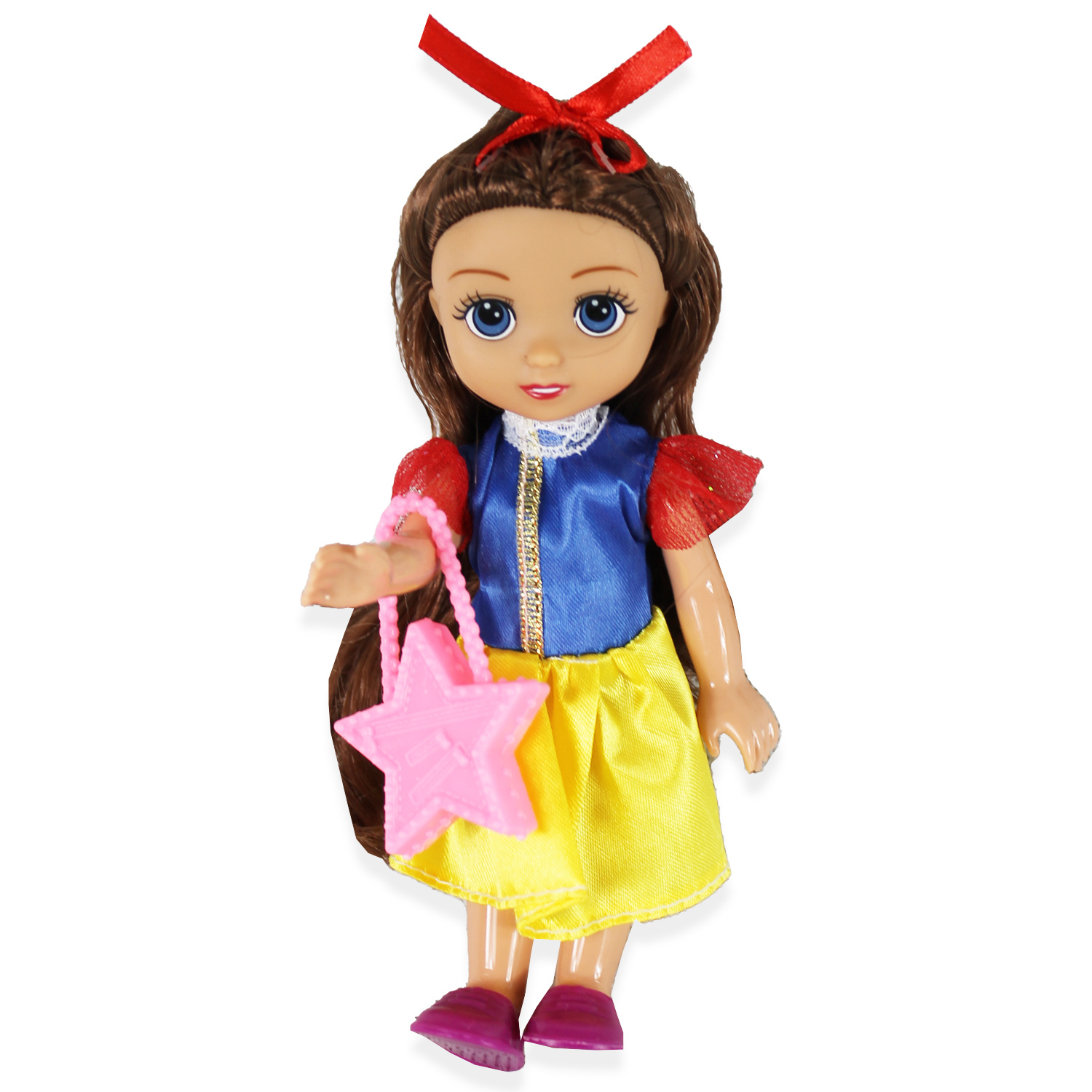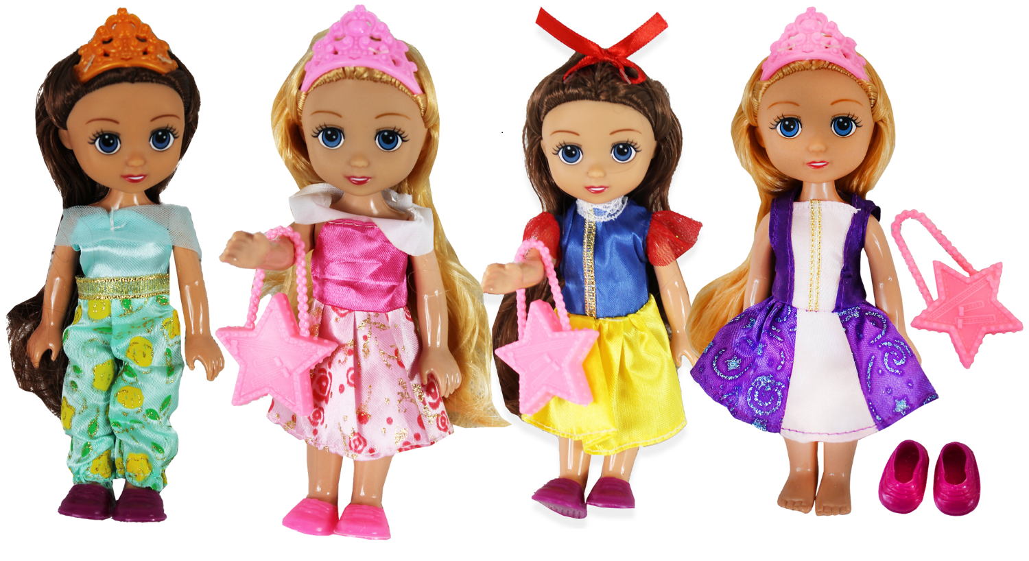- Śnieżka – to urocza i miła księżniczka. Ma ciemne włosy, a na nich czerwoną kokardkę. Ma czerwone usta i piękne oczy. Ubrana jest w długą sukienkę, która składa się z niebieskiej bluzki z bufiastymi, czerwonymi rękawkami oraz żółtej spódnicy. Na nóżkach ma fioletowe pantofle. Całości dopełniona różowa torebka w kształcie gwiazdy.