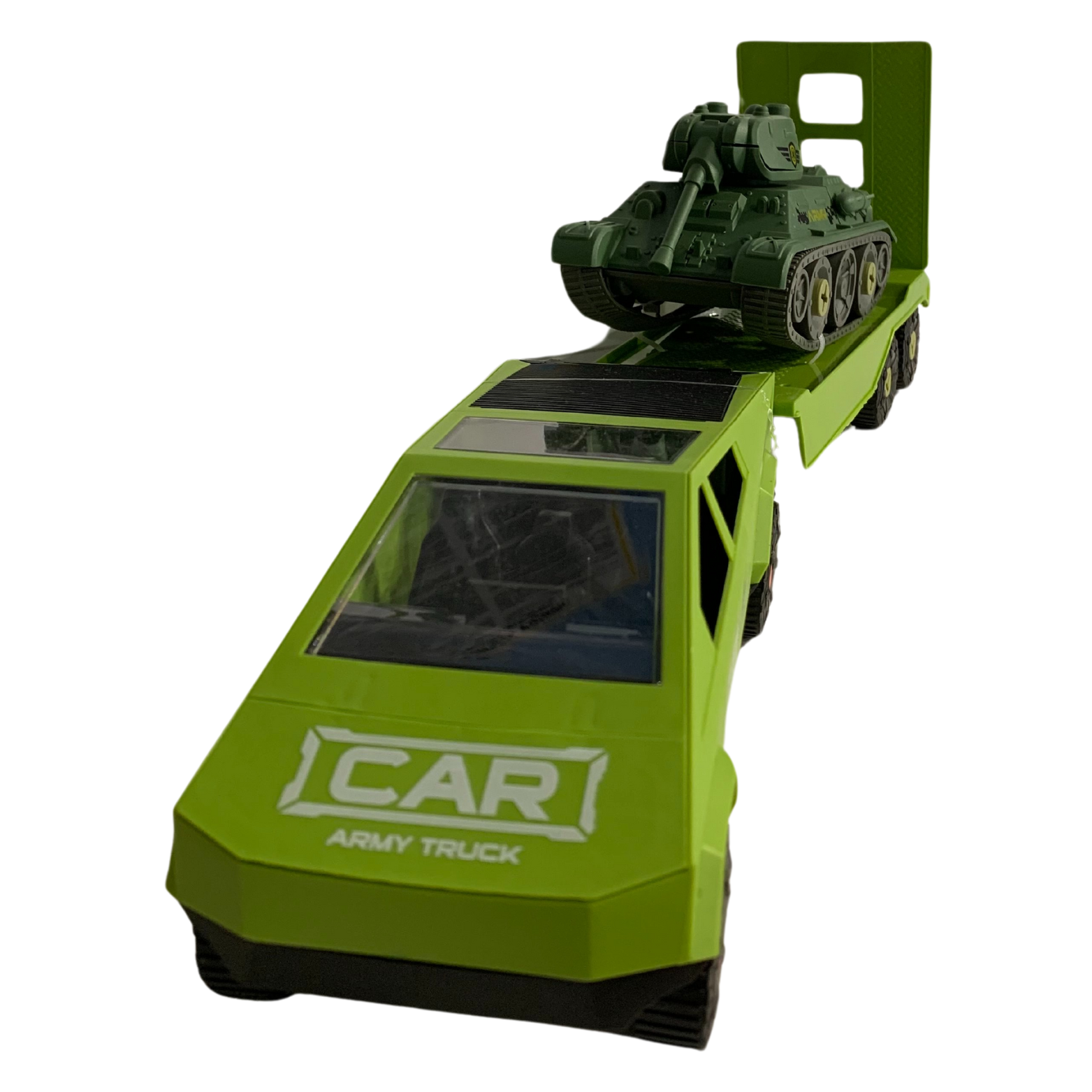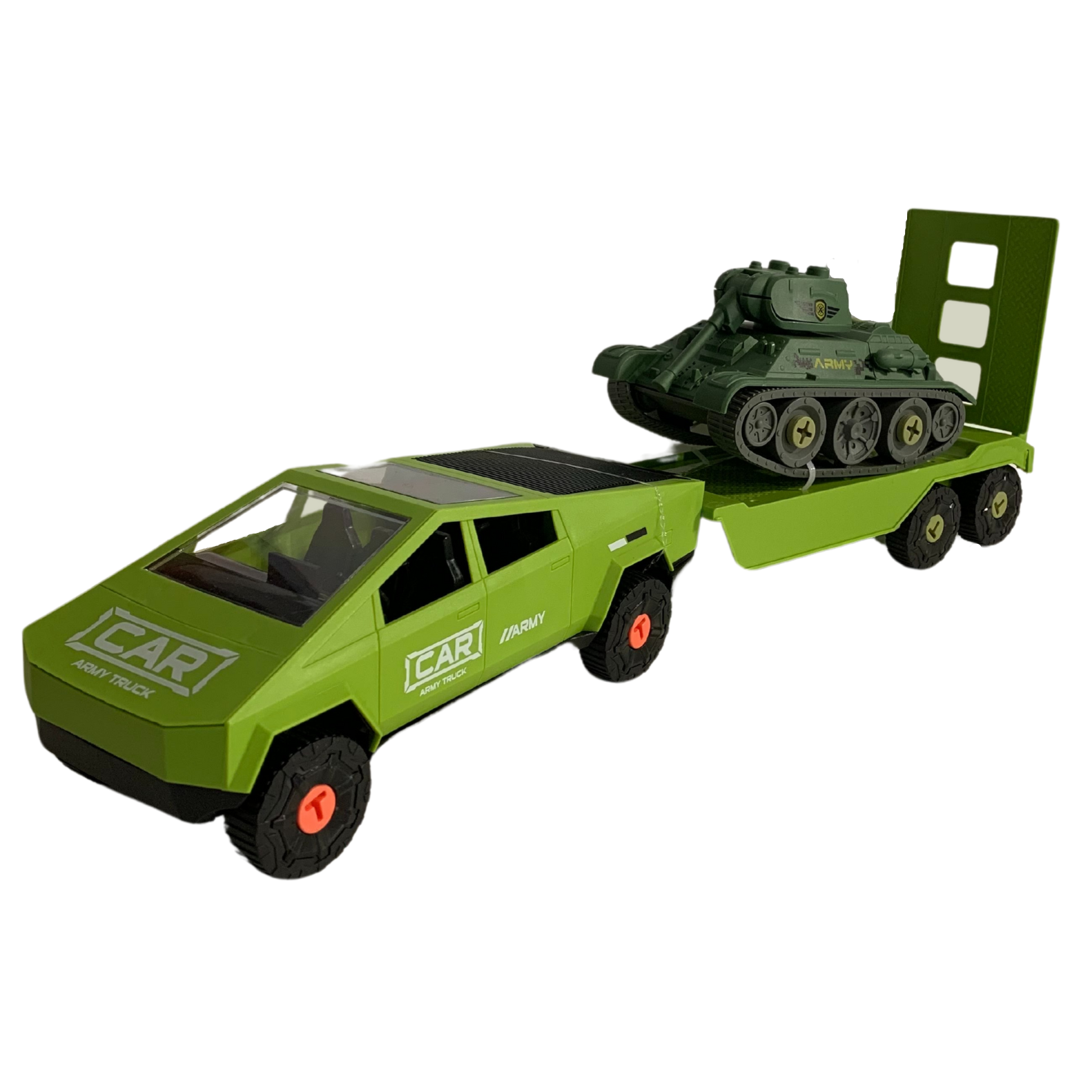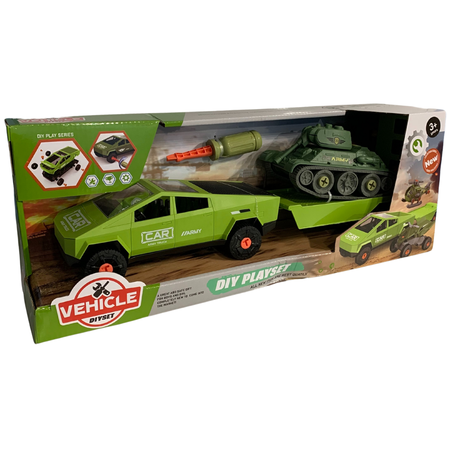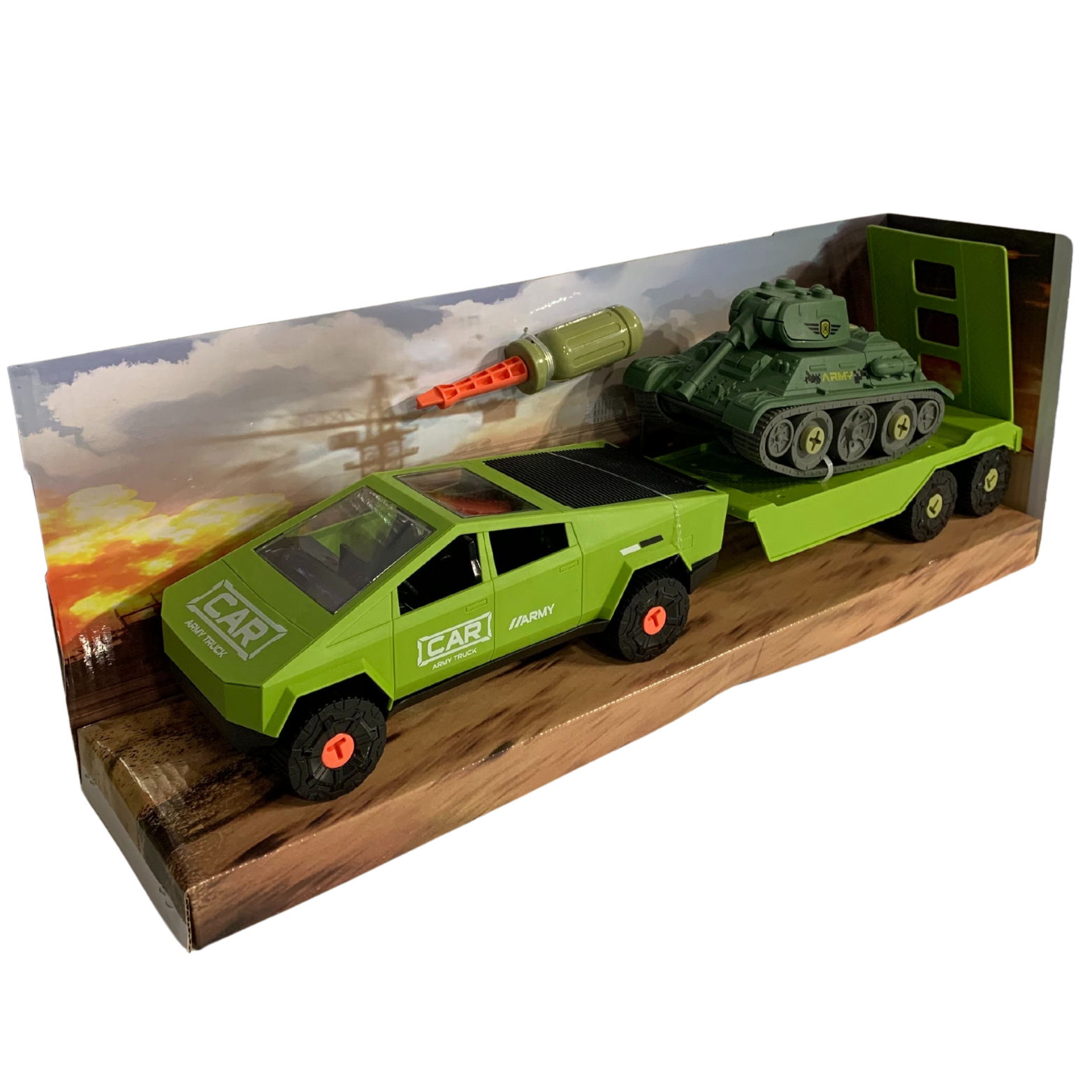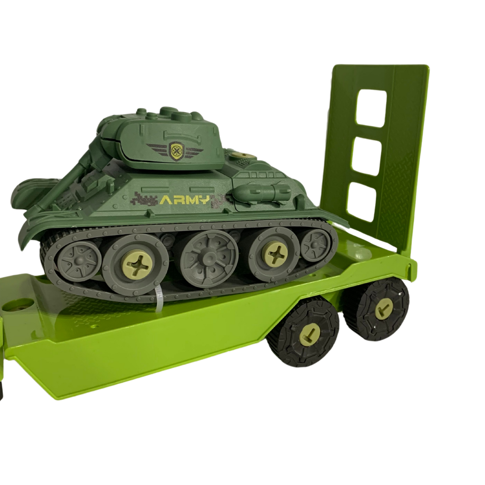 Samochód z przesuwaną przyczepą to główny element zestawu. Wyposażony w ruchome części, samochód oferuje pełen zakres zabawy. Koła pojazdu można samodzielnie wkręcać i wykręcać, co rozwija zdolności motoryczne dziecka. Przyczepa zawiera czołg gotowy do startu! Elementy czołgu również można montować samodzielnie.