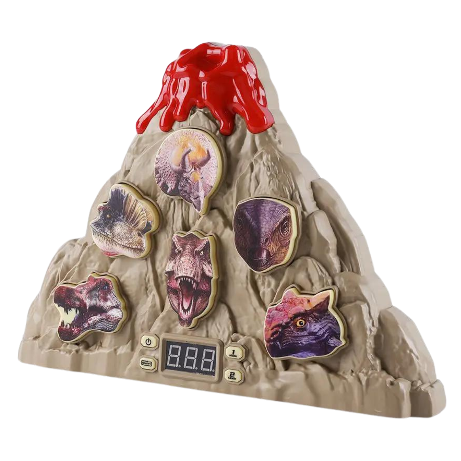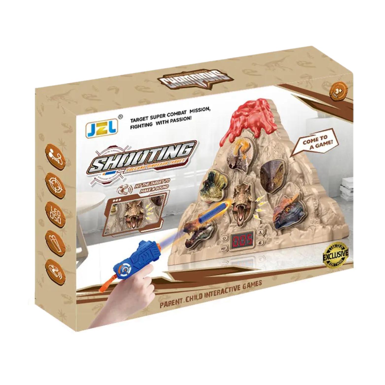Elektryczna tarcza w formie wulkanu stanowi centralny punkt gry. Dinozaury umieszczone na tarczy są celami, do których dzieci strzelają, zdobywając punkty. Strzelając do dinozaura na środku zdobywa się 2 punkty, trafienie w pozostałe dinozaury zapewnia 1 punkt. Zestaw oferuje dwa tryby gry, pierwszy jest nieograniczony czasowo, natomiast drugi to dwuminutowe odliczanie.